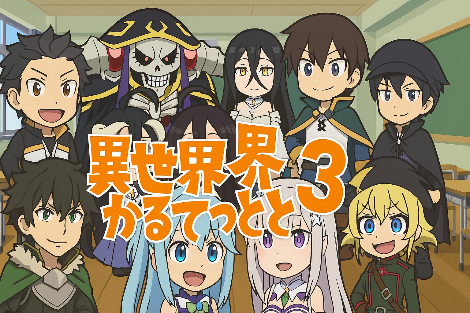 『異世界かるてっと3』は、異なる作品世界のキャラクターたちがひとつの教室で繰り広げる、笑いと混乱の連続アニメ。ぷちキャラたちの愛らしい姿と、原作さながらの“らしさ”を残した掛け合いが魅力です。