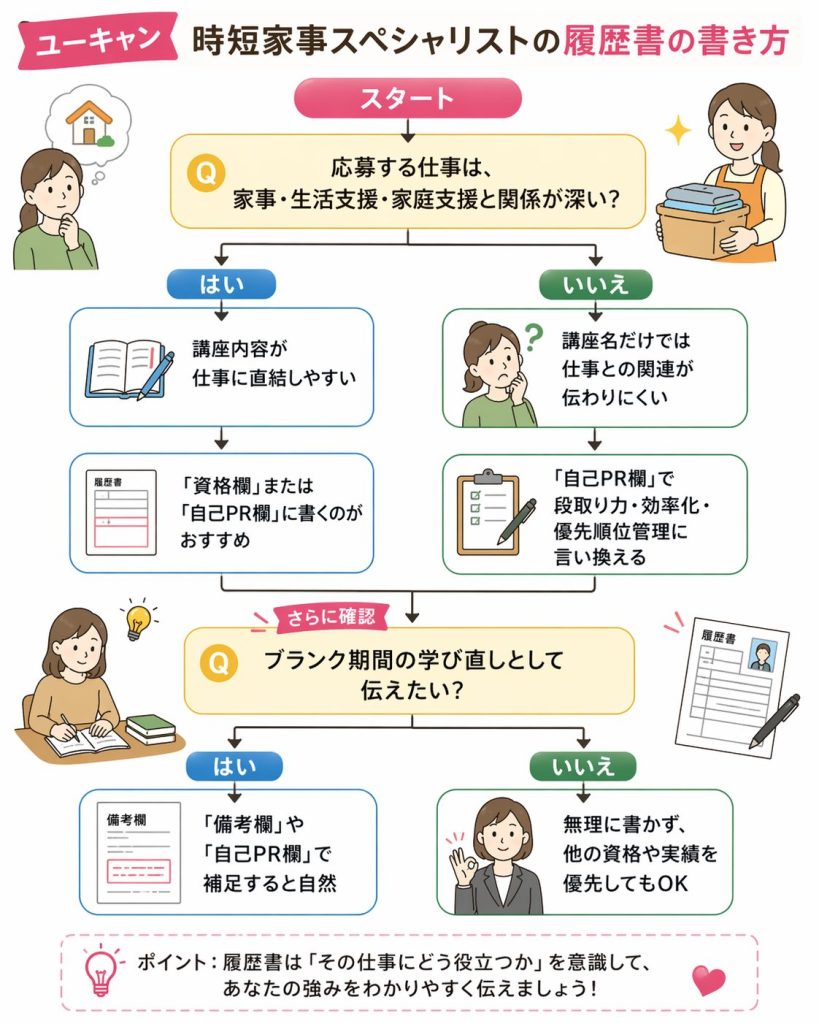 そのため、ユーキャン時短家事スペシャリストを履歴書に書く場合は、単に名称を書くだけでなく、どんな力を身につけたのかまで意識して見せることが大切です。
